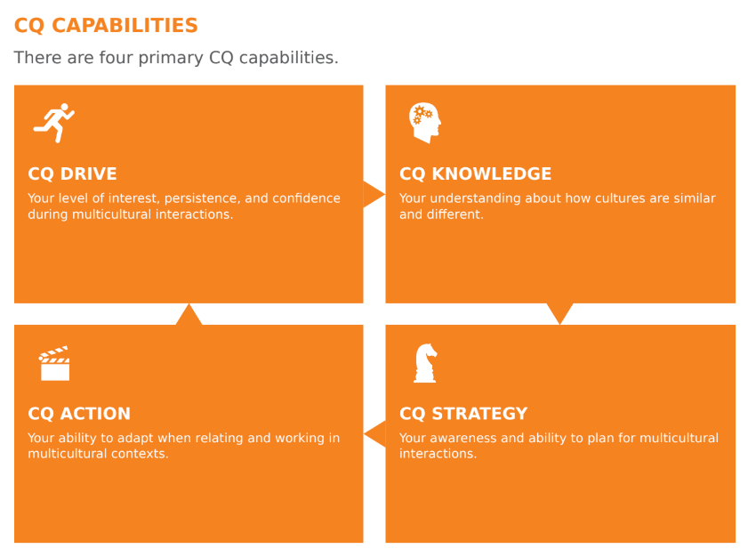 I recently learned of the term Cultural Intelligence (CQ) and took a comprehensive assessment to determine my CQ in the four primary capabilities - Drive, Knowledge, Action, Strategy.